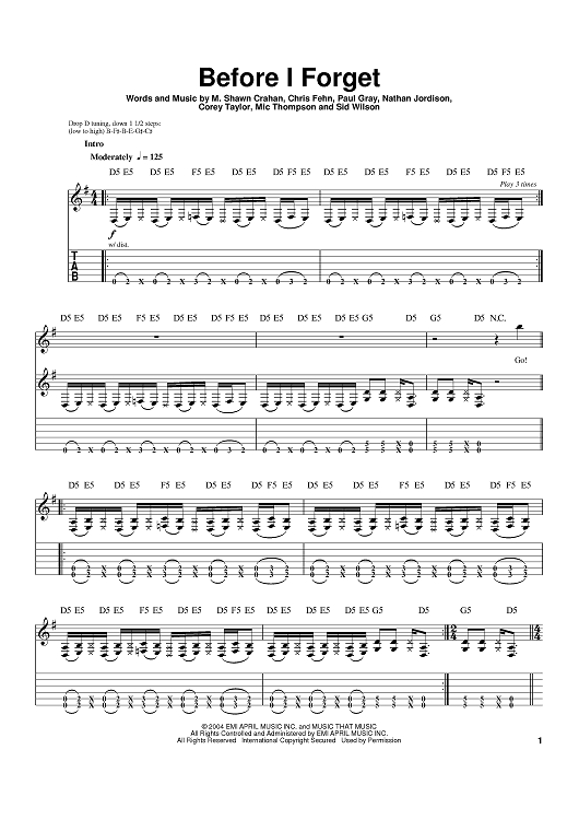 Digital Sheet Music for Before I Forget by Shawn Crahan, Chris Fehn, Paul Gray, Joey Jordison, Slipknot, Corey Taylor, Mic Thompson, Sid Wilson scored for Guitar Tab; id:391294