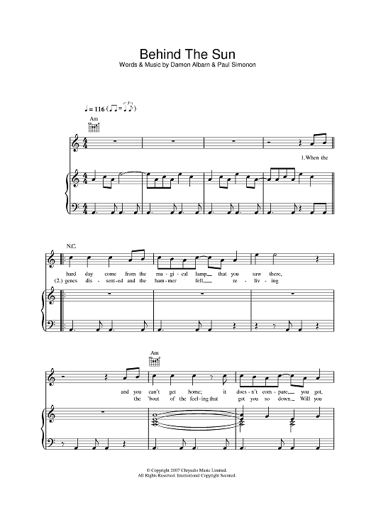 Digital Sheet Music for Behind The Sun by Paul Simonon, Damon Albarn scored for Piano/Vocal/Chords; id:401933