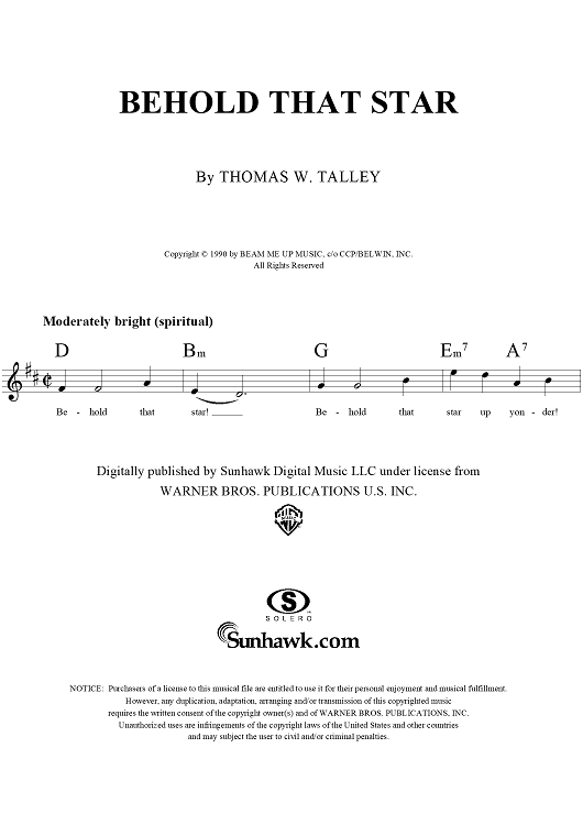 Digital Sheet Music for Behold That Star by Thomas W. Talley scored for Lead Sheet; id:259631