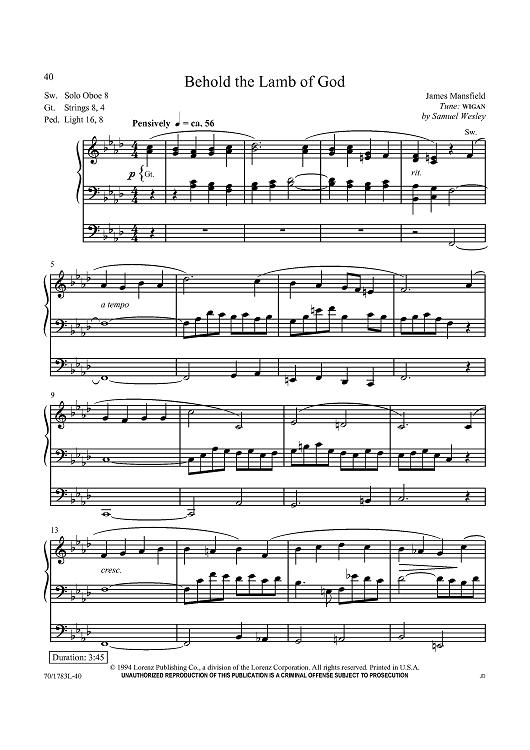 Digital Sheet Music for Behold the Lamb of God by Samuel Sebastian Wesley, James Mansfield scored for Organ Solo; id:433965