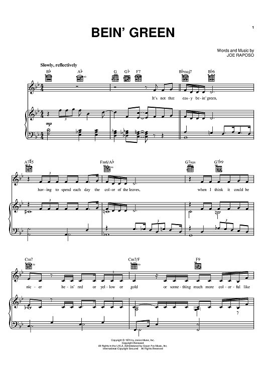 Digital Sheet Music for Bein' Green by Frank Sinatra, Joe Raposo, Kermit The Frog, The Muppets scored for Piano/Vocal/Chords; id:384934