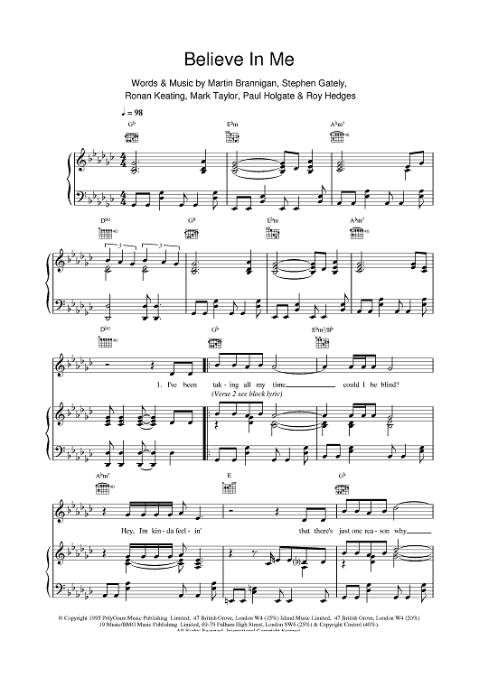 Digital Sheet Music for Believe In Me by Mark Taylor, Ronan Keating, Boyzone, Martin Brannigan, Stephen Gately, Ray Hedges, Paul Holgate scored for Piano/Vocal/Chords; id:376074