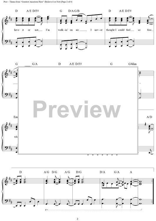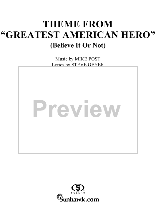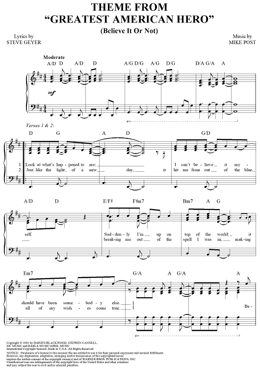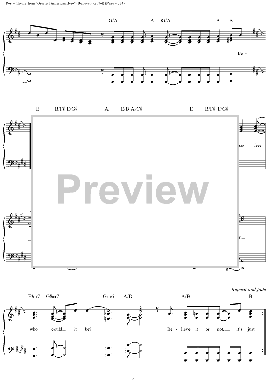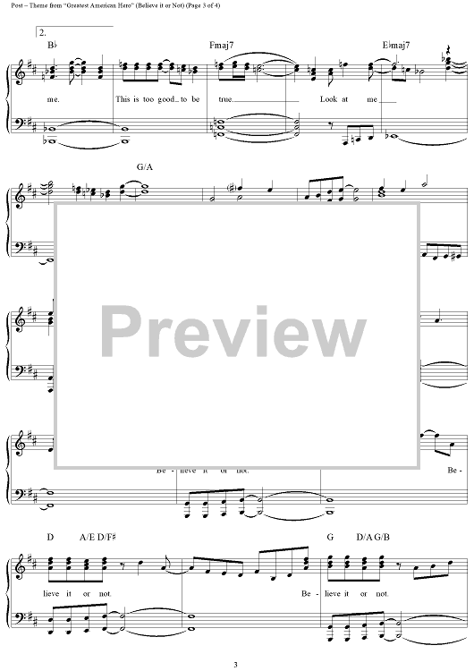 Digital Sheet Music for Believe It or Not by Mike Post, Joey Scarbury, Stephen Geyer scored for Piano/Vocal/Chords; id:254930