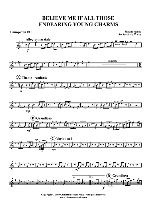 "Believe Me If All Those Endearing Young Charms - Trumpet 1 in Bb" Sheet Music by Simone Mantia