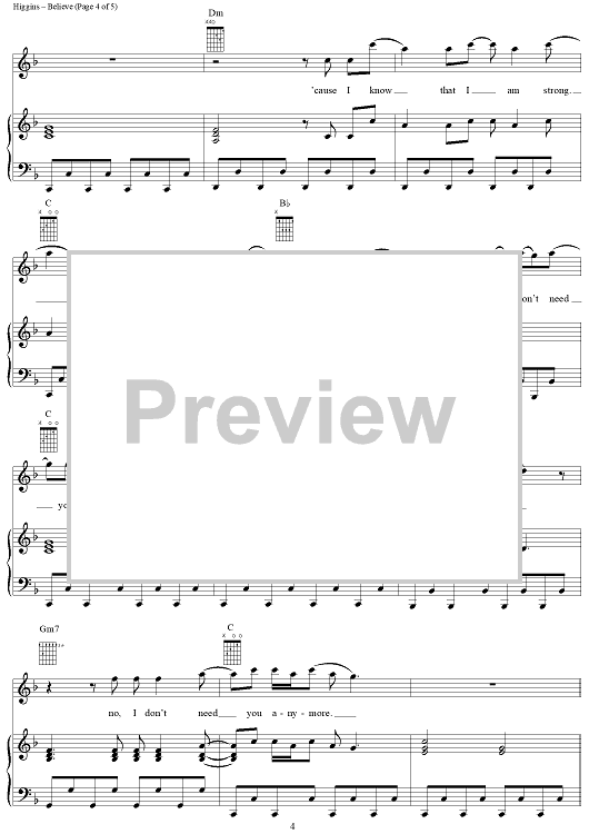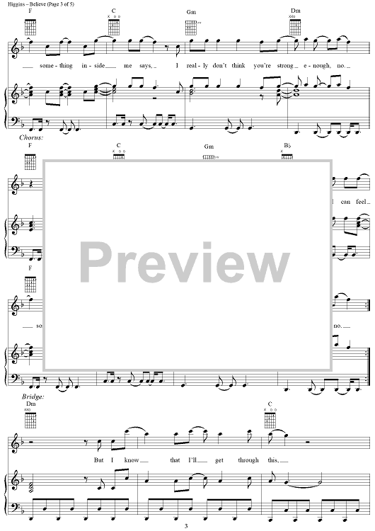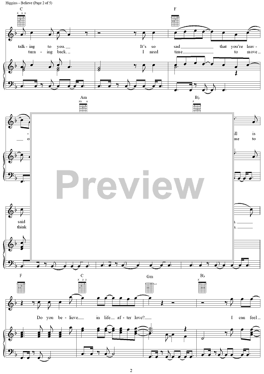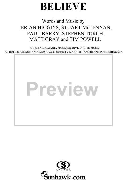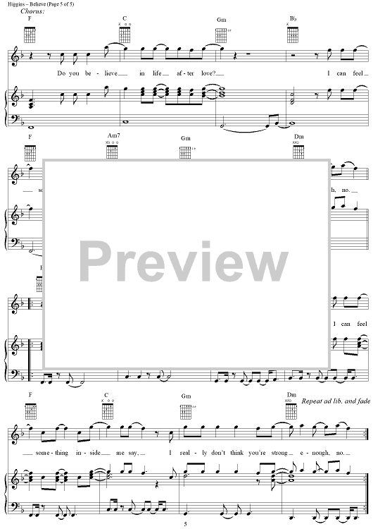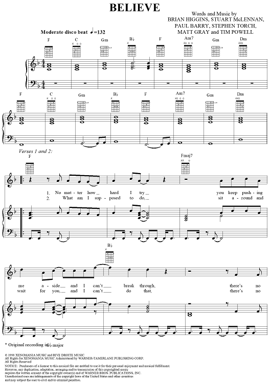 Digital Sheet Music for Believe by Cher, Brian Higgins, Stuart McLennan, Timothy Gatlin, Stephen Torch, Matt Gray, Tim Powell scored for Piano/Vocal/Chords; id:112759