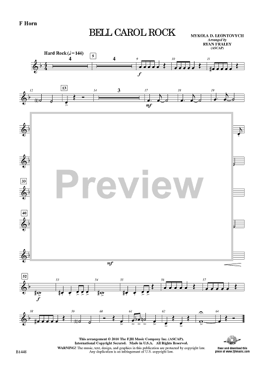 Digital Sheet Music for Bell Carol Rock - F Horn by Ryan Fraley, Mykola D. Leontovych scored for Developing Band; id:415276