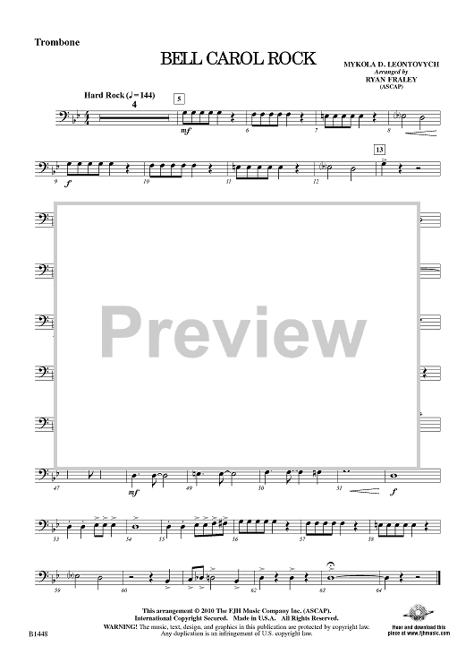Digital Sheet Music for Bell Carol Rock - Trombone by Ryan Fraley, Mykola D. Leontovych scored for Developing Band; id:415277