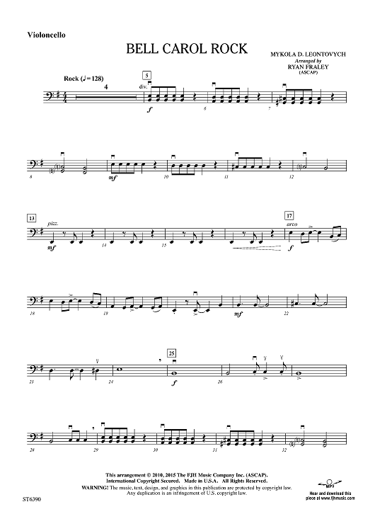 Digital Sheet Music for Bell Carol Rock - Violoncello by Ryan Fraley, Mykola D. Leontovych scored for Orchestra; id:455644