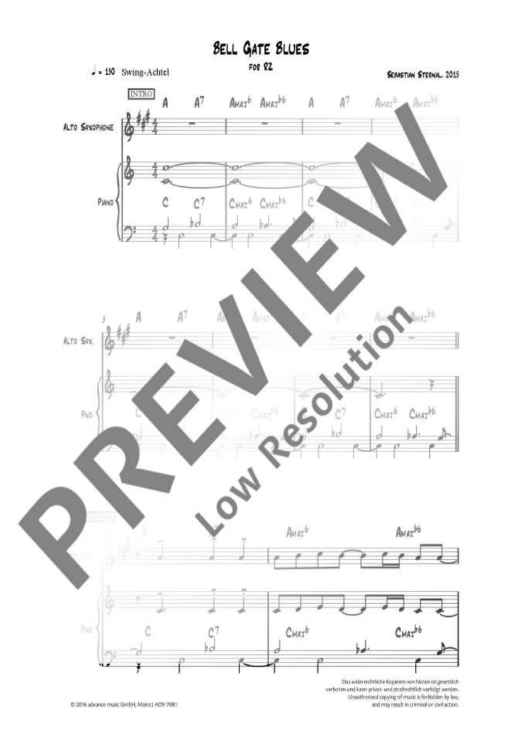 "Bell Gate Blues" comes along as a light, swinging piece for alto saxophone and piano with bluesy elements reflected in its harmony. As is usual in jazz music, the piece contains a short solo part in which the performer can either freely improvise or play the notated saxophone solo.