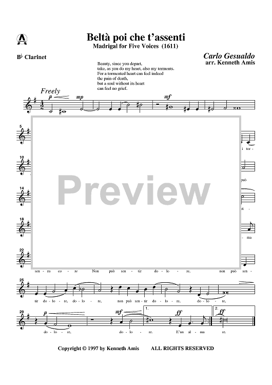 Digital Sheet Music for Belta poi che t'assenti - Clarinet in B-flat by , Carlo Gesualdo, Kenneth Amis scored for Woodwind Quintet; id:365529
