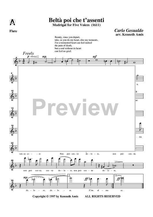 Digital Sheet Music for Belta poi che t'assenti - Flute by , Carlo Gesualdo, Kenneth Amis scored for Woodwind Quintet; id:365527