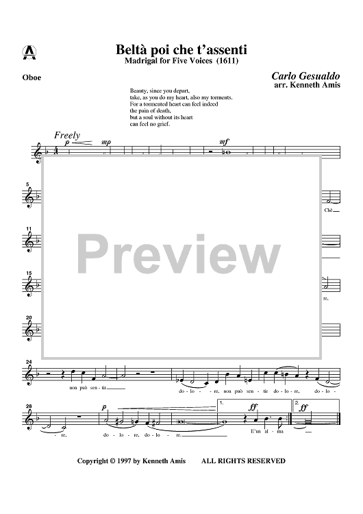 Digital Sheet Music for Belta poi che t'assenti - Oboe by , Carlo Gesualdo, Kenneth Amis scored for Woodwind Quintet; id:365528