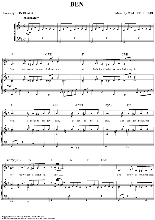 Digital Sheet Music for Ben by Don Black, Michael Jackson, Walter Scharf scored for Piano/Vocal/Chords; id:148645