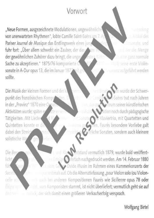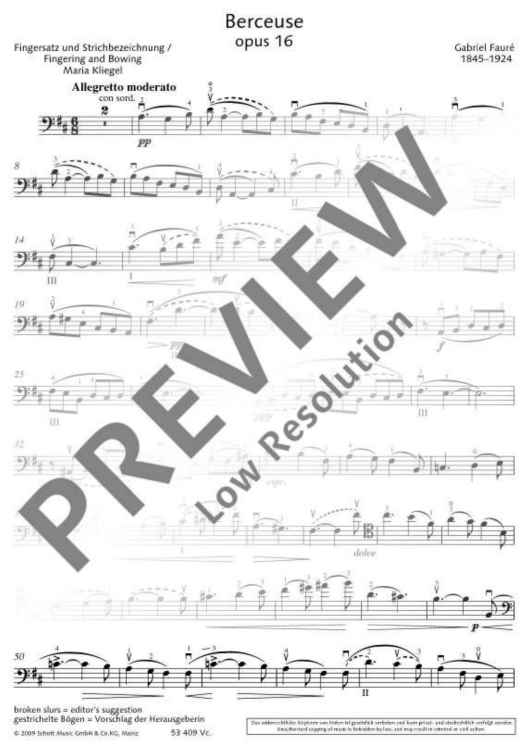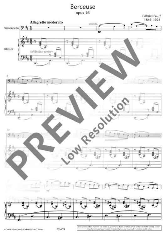 'New forms, well-chosen modulations, strange timbres, the use of wholly unexpected rhythms', this is how Camille Saint-Saëns praised the first work of a young colleague, the First Violin Sonata by Gabriel Fauré (1845-1924), in the Paris Journal de Musique on 22 May 1877. He continued: 'Over it and around it hovers a charm which persuades the mass of ordinary listeners to accept the most violent novelties as being entirely natural.' Chamber music and the small forms continued to be the special fields of interest of this important French composer at the end of the 19th century and at the beginning of the 20th century. Fauré had a special liking for string instruments, particularly of the violoncello for which he wrote not only two wonderful sonatas but also some small solo works. Berceuse Op. 16 was written for violin in 1878/79; the present arrangement now allows even violoncellists to indulge in this beguiling and melodious lullaby.