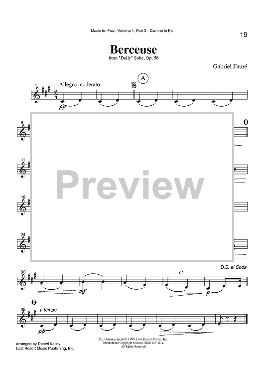 Digital Sheet Music for Berceuse - from "Dolly" Suite, Op. 56 - Part 3 Clarinet in Bb by , Gabriel Fauré, Daniel Kelley scored for Instrumental Quartet; id:423656