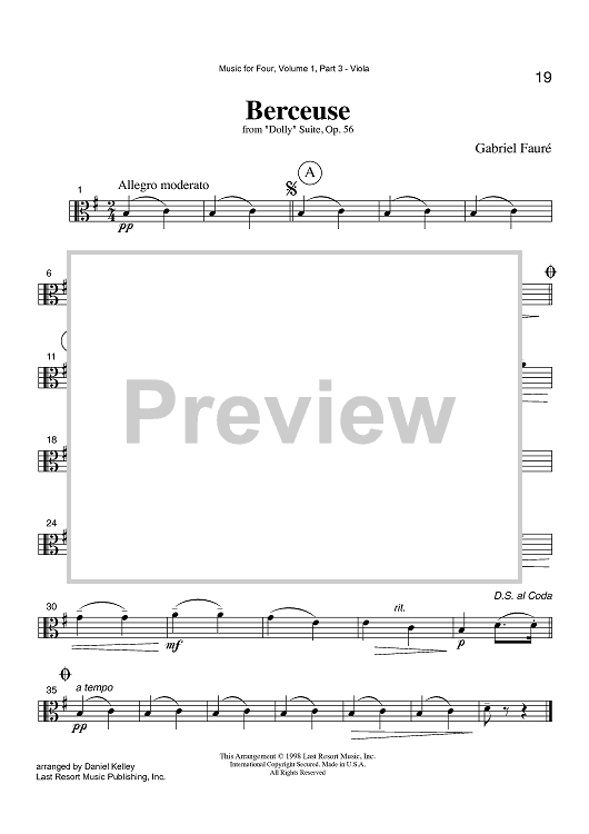 Digital Sheet Music for Berceuse - from "Dolly" Suite, Op. 56 - Part 3 Viola by , Gabriel Fauré, Daniel Kelley scored for Instrumental Quartet; id:423654