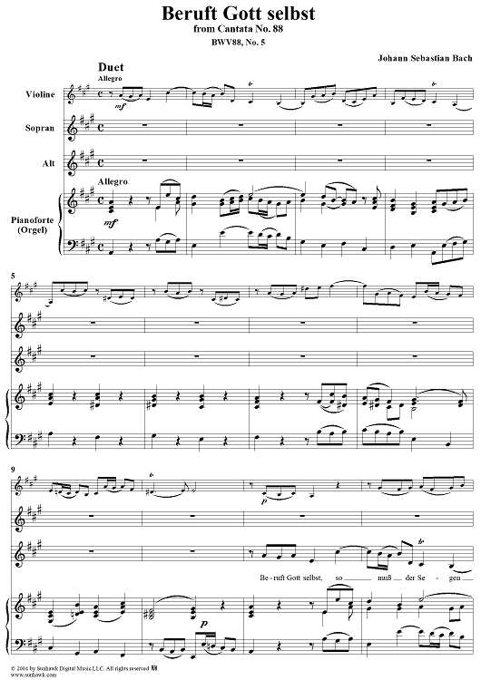 Digital Sheet Music for "Beruft Gott selbst", Duet, No. 5 from Cantata No. 88: "Siehe, ich will viel Fischer aussenden" - Piano Score by Johann Sebastian Bach scored for Soprano, Alto, Violin and Piano or Organ; id:304064