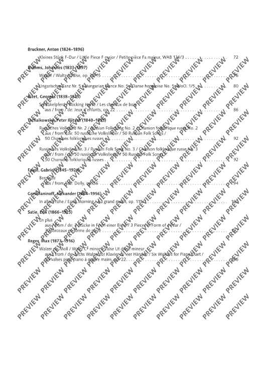 In the successful Best of Piano Classics series, two more collections of original works and arrangements are published, now for piano four hands, for double the joy of playing the instrument: Best of Piano Duets 1 contains 20 original duets, including the popular Waltz and Hungarian Dance No. 5 by Brahms or the Military March by Schubert. Best of Piano Duets 2 contains 20 arrangements for discerning lovers of classical masterpieces, including the famous Canon by Pachelbel, "Das klinget so herrlich" from Mozart's Magic Flute or Morning Mood by Grieg. Completed with fingerings, tempo suggestions and pedal indications and published in a modern and reader-friendly layout, these great-sounding original pieces and arrangements, selected for advanced players, are recommended not only for lessons but also for any amateur musician who loves to play the piano.