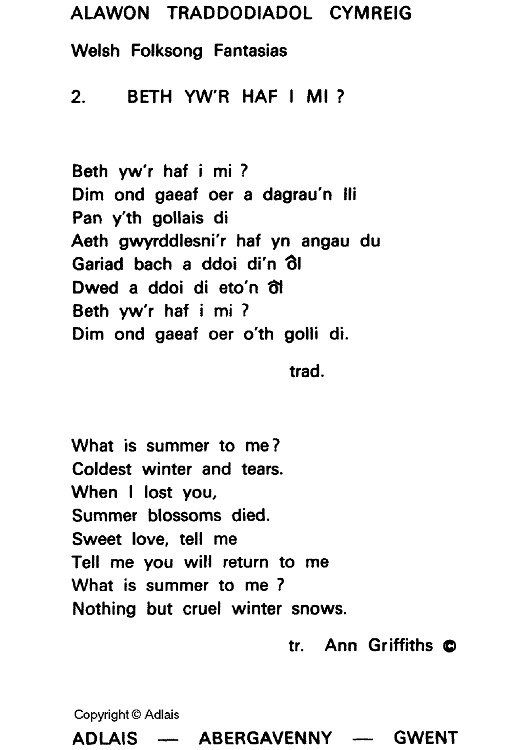 "Beth Yw'r Haf I Mi? Fantasia on a Welsh Folk Song" Sheet Music by Traditional