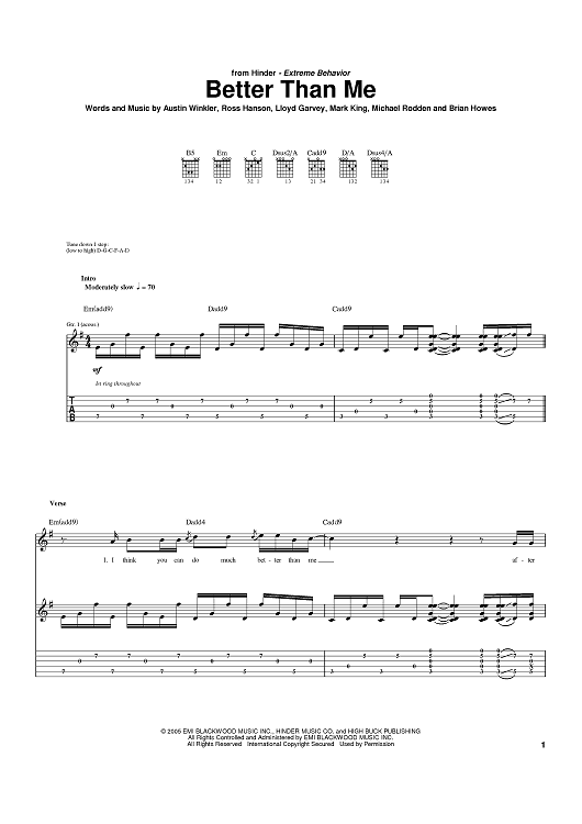 Digital Sheet Music for Better Than Me by Brian Howes, Lloyd Garvey, Ross Hanson, Hinder, Mark King, Michael Rodden, Austin Winkler scored for Guitar Tab; id:394207