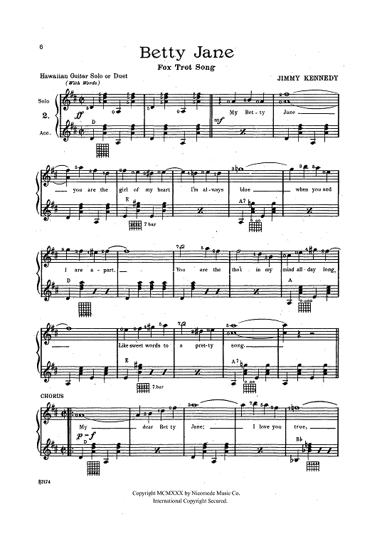 Digital Sheet Music for Betty Jane by , Jimmy Kennedy, Paula Nahiku scored for Hawaiian Guitar; id:429418