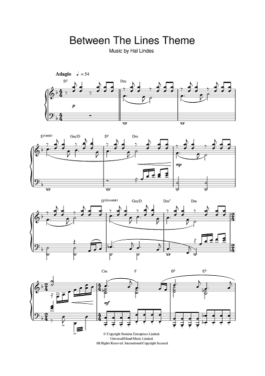 Digital Sheet Music for Between The Lines Theme by Hal Lindes scored for Piano; id:384852