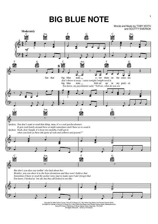 Digital Sheet Music for Big Blue Note by Scott Emerick, Toby Keith scored for Piano/Vocal/Chords; id:386137