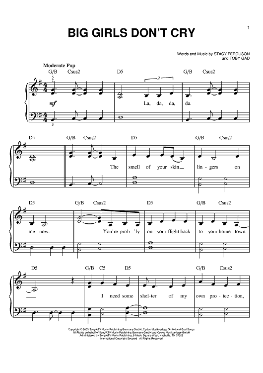 Digital Sheet Music for Big Girls Don't Cry by Fergie, Toby Gad scored for Easy Piano; id:398429