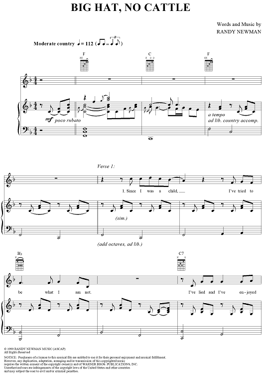 "Big Hat, No Cattle" Sheet Music by Randy Newman