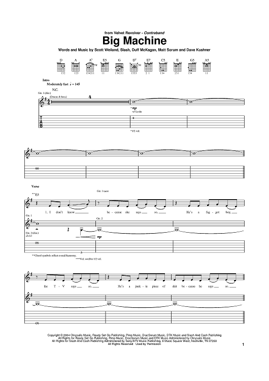 Digital Sheet Music for Big Machine by Scott Weiland, Slash, Dave Kushner, Duff McKagan, Matt Sorum, Velvet Revolver scored for Guitar Tab; id:383506