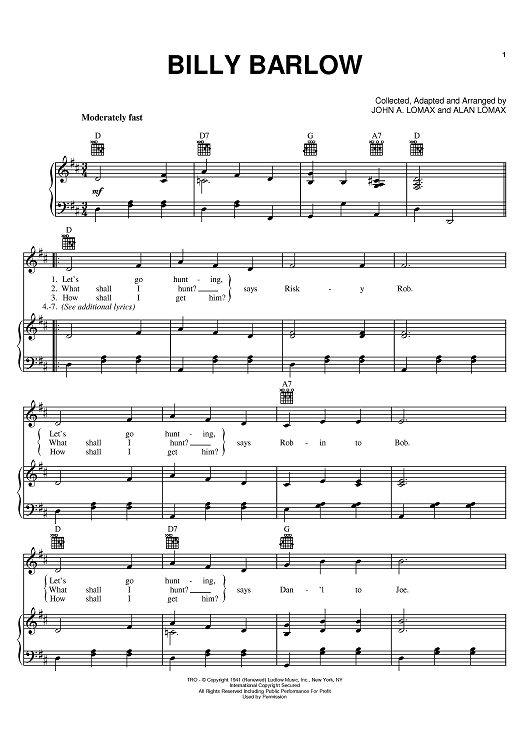 Digital Sheet Music for Billy Barlow by John A. Lomax, Alan Lomax scored for Piano/Vocal/Chords; id:381373
