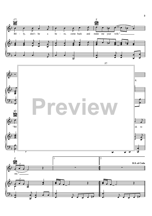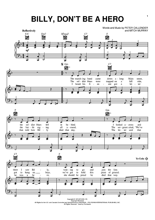 Digital Sheet Music for Billy, Don't Be A Hero by Mitch Murray, Peter Callander, Bo Donaldson and The Heywoods, Paper Lace scored for Piano/Vocal/Chords; id:381523