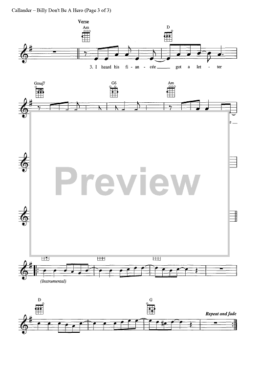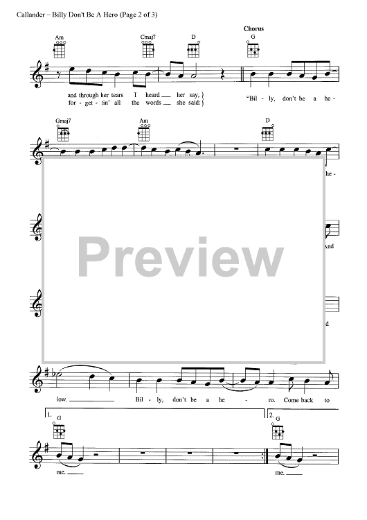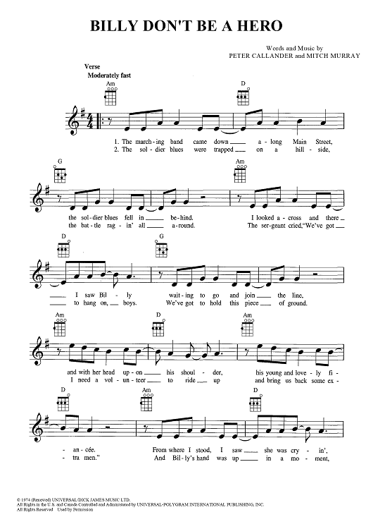Digital Sheet Music for Billy Don't Be a Hero by Mitch Murray, Peter Callander, Paper Lace scored for Ukulele/Vocal; id:449638