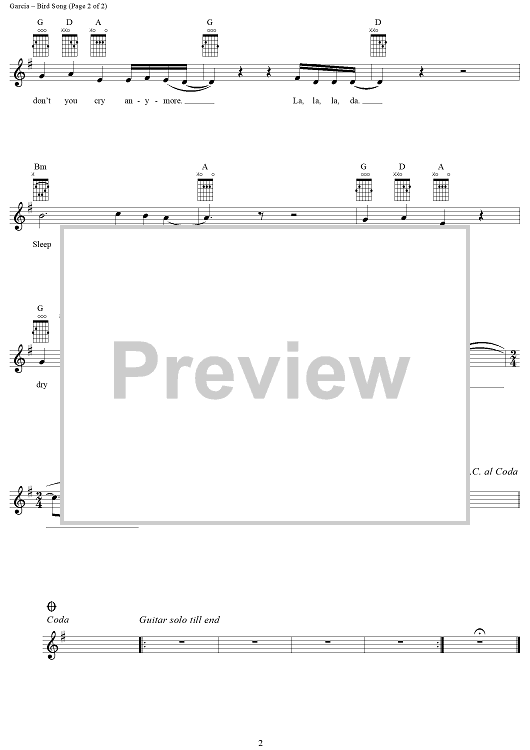 "Bird Song" Sheet Music by Jerry Garcia