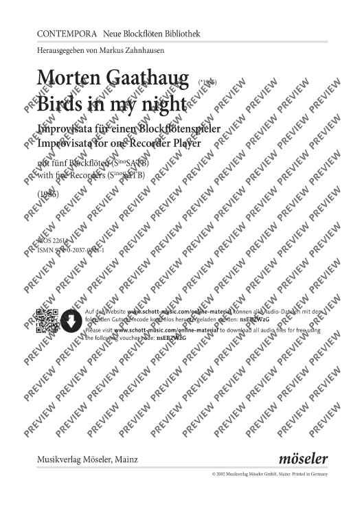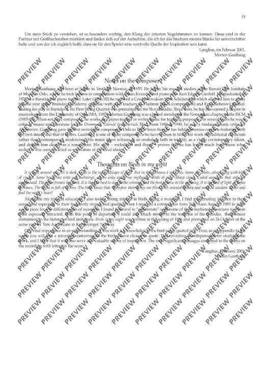 Gaathaug bewegt sich mit seinem Werk in den Fussstapfen Olivier Messiaens. Der norwegische Komponist verbindet Vogelstimmen aus aller Welt (im Original auf der Aufnahme zu hören) mit seiner fantasievollen, idiomatischen Musik zu einem einzigartigen, anspruchsvollen Solostück, in dem alle Blockflöten vom Sopranino bis zum Bass zum Einsatz gelangen