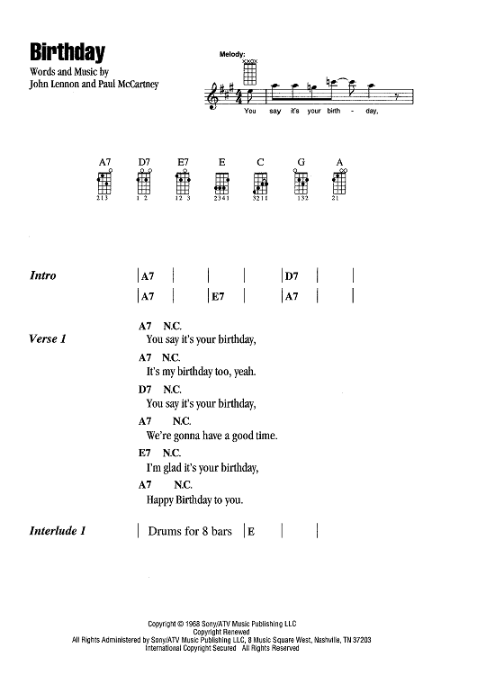 Digital Sheet Music for Birthday by Paul McCartney, The Beatles, John Lennon scored for Ukulele/Vocal; id:466334