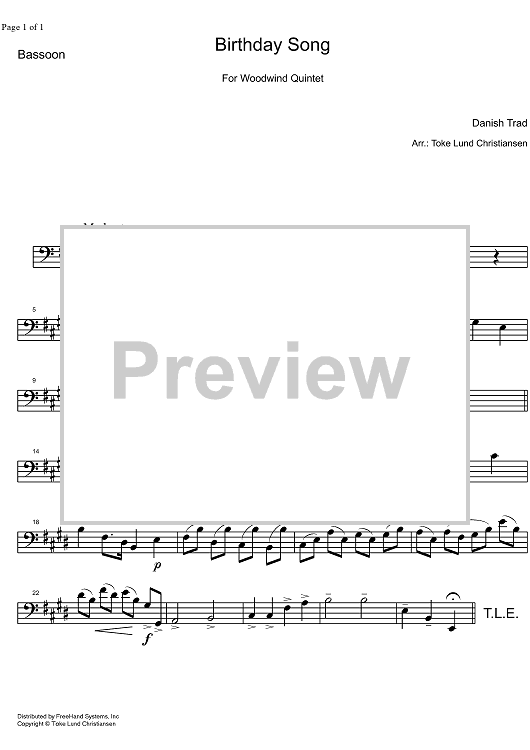 Digital Sheet Music for Birthday Song Danish Traditional - Bassoon by , Toke Lund Christiansen, Traditional scored for Wind Quintet; id:327842