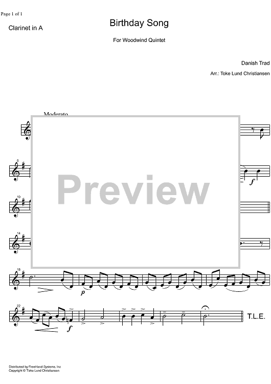 Digital Sheet Music for Birthday Song Danish Traditional - Clarinet by , Toke Lund Christiansen, Traditional scored for Wind Quintet; id:327841