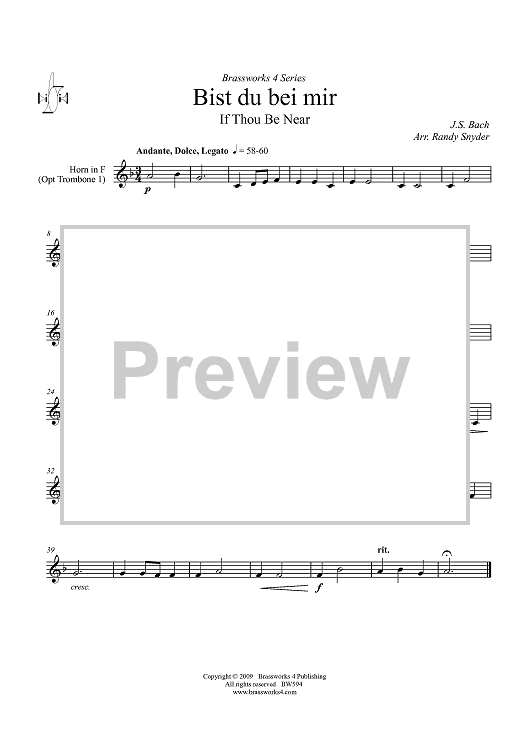 Digital Sheet Music for Bist Du Bei Mir - Horn in F (opt. Trombone 1) by Johann Sebastian Bach, Randy Snyder scored for Brass Quartet; id:410583
