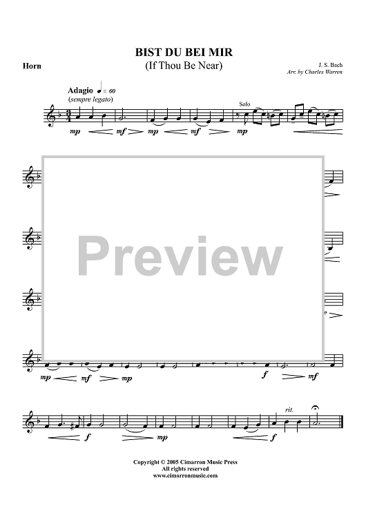 Digital Sheet Music for Bist du bei Mir (If Thou Be Near) - Horn by Charles Warren, Johann Sebastian Bach scored for Brass Quintet; id:316873