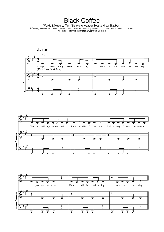 Digital Sheet Music for Black Coffee by All Saints scored for Piano/Vocal/Chords; id:377142