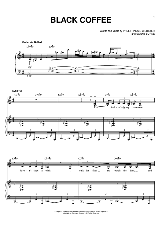 Digital Sheet Music for Black Coffee by Sarah Vaughan, Ella Fitzgerald, Paul Francis Webster, Sonny Burke, Peggy Lee, Julie London scored for Piano/Vocal/Chords; id:380436