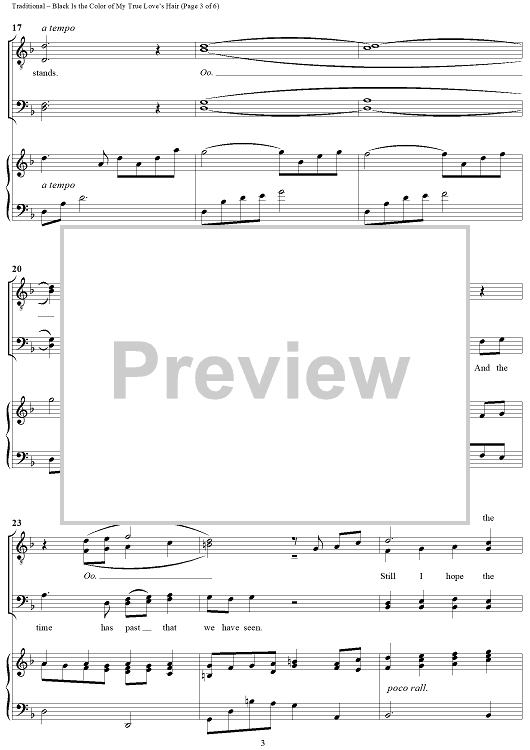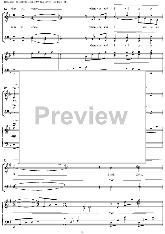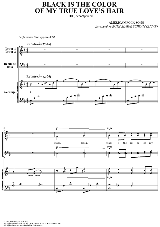 Digital Sheet Music for Black is the Color of My True Love's Hair by Ruth Elaine Schram, American Folk Song scored for TTBB Choir/Piano; id:318682