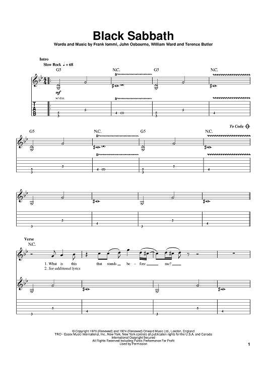 Digital Sheet Music for Black Sabbath by Bill Ward, Black Sabbath, Geezer Butler, Tony Iommi, Ozzy Osbourne scored for Guitar Tab; id:397526
