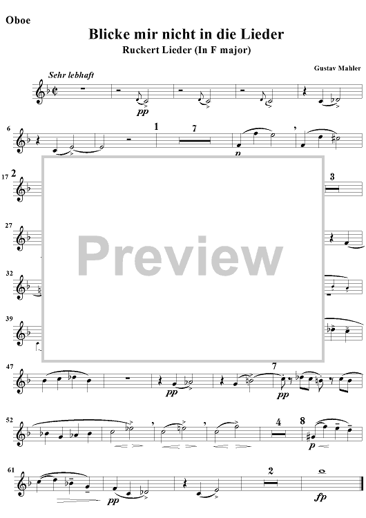 Digital Sheet Music for Blicke mir nicht in die lieder - Oboe by Gustav Mahler, Friedrich Rückert scored for Voice/Chamber Orchestra; id:250955