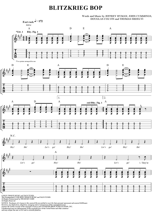 Digital Sheet Music for Blitzkrieg Bop by Douglas Colvin, Thomas Erdelyi, Ramones, Jeffrey Hyman, John Cummings scored for Guitar Tab/Vocal; id:119996