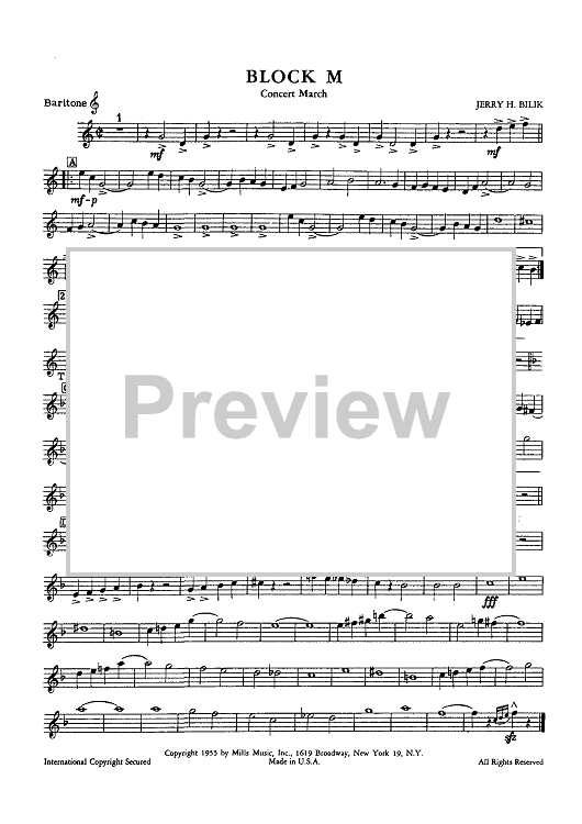 Digital Sheet Music for Block M - Concert March - Baritone TC by , Jerry H. Bilik scored for Concert Band; id:432997