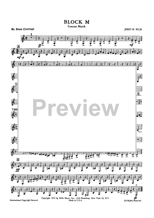 Digital Sheet Music for Block M - Concert March - Bb Bass Clarinet by , Jerry H. Bilik scored for Concert Band; id:432975