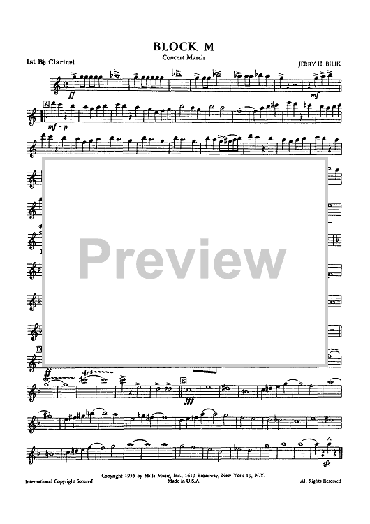 Digital Sheet Music for Block M - Concert March - Bb Clarinet 1 by , Jerry H. Bilik scored for Concert Band; id:432971