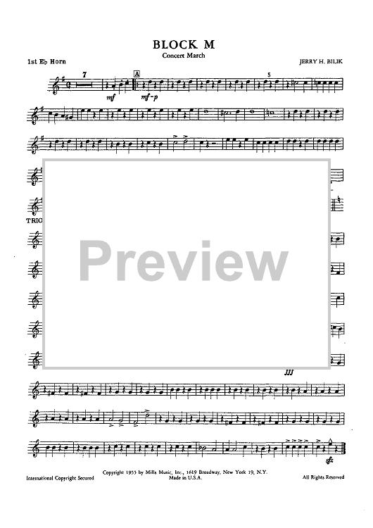 Digital Sheet Music for Block M - Concert March - Horn 1 in Eb by , Jerry H. Bilik scored for Concert Band; id:432985